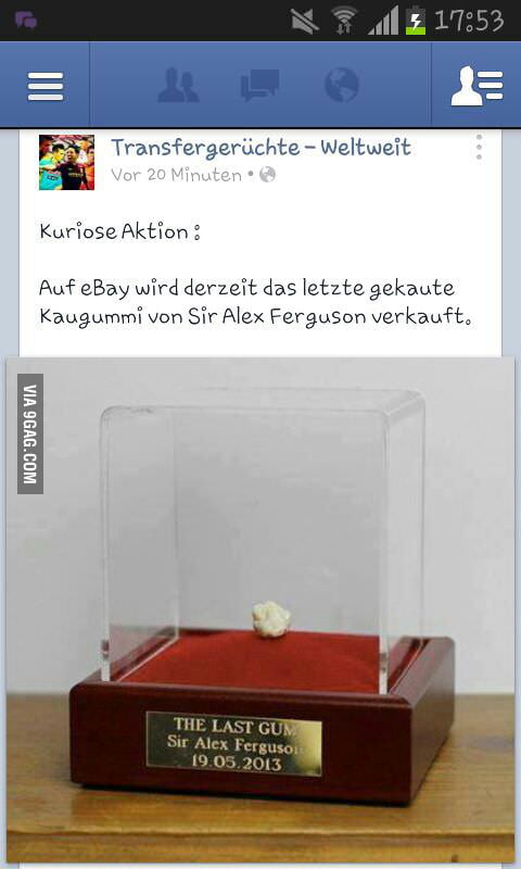 Letzter Kaugummi von Alex Ferguson versteigert Der angeblich letzte Kaugummi des Trainer-Ruheständlers Sir Alex Ferguson ist nach Medienberichten bei. Ein besserer Vorschlag wäre unserer Ansicht nach Manchester United. Der angeblich letzte Kaugummi von Sir Alex Ferguson als Trainer bei Manchester United ist nach Medienberichten bei Ebay für rund eine halbe Million Euro versteigert worden.
